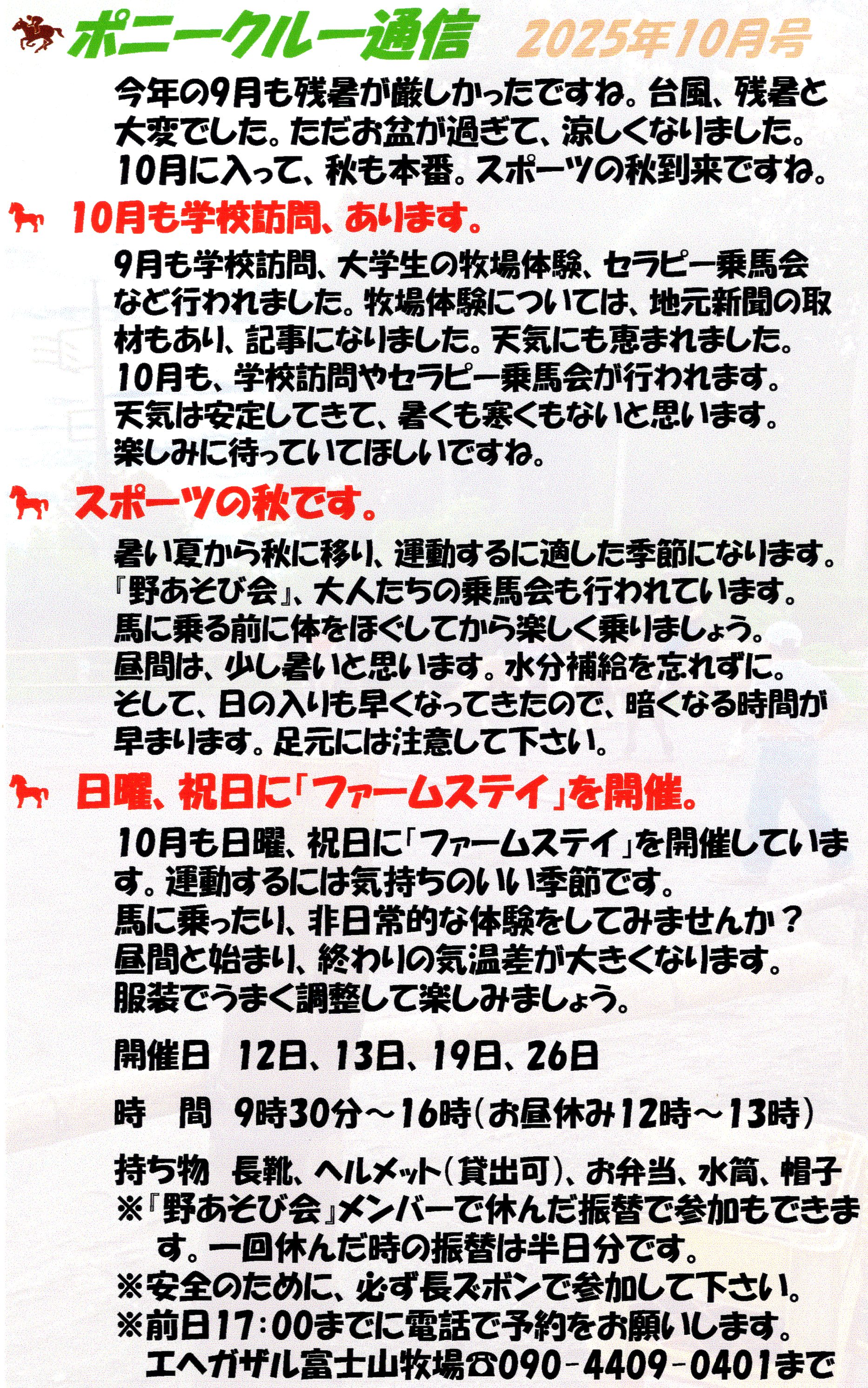 先週、雨天で実施されなかった「大中里こども園」の訪問が、17日火曜日の午前に変更になります。17日に訪問予定の「北山小学校」が、翌日の18日水曜日に。18日に予定されていた「金曜チーム」の乗馬会が16日月曜日に変更されましたので、お知らせいたします。