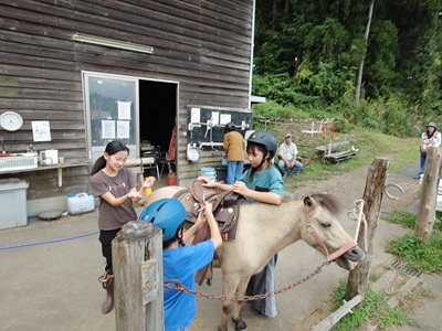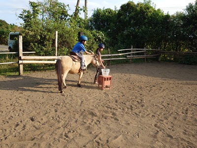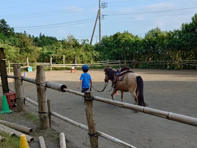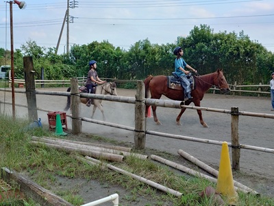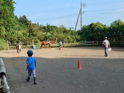 こんばんは。スーさんです。 昨日は、暑かったですね。33℃まで気温が上がったところが県内でもありました。 そして今日は、やや曇りがち。気温も昨日ほどは上がらなかったですが、やや暑い感じ。 日々の気温差、朝・晩と昼間の温度差が大きいです。 今日は午後から牧場へ。 「Wacca!」のセラピー乗馬会からスタート。 リオの馬房掃除をして、乗馬。 今日は「ピンポン玉運び」をやりました。 速歩になると振動が大きくなってしまうので落としてしまう確率が高くなります。 そのあとは、臨時の『野あそび会』です。 振替がたまっているメンバー向けに行われました。 ![]() 参加したのは土曜日メンバー四人。 キクとラッキーに別れて乗りました。 ![]() 「ピンポン玉運び」をやりました。 まずは引き馬の練習で、速歩を出せるか練習します。 馬は無理に引っ張れば走ってくれるわけではないです。 ![]() 開始から終わりまですべて速歩でできれば、10点。 速歩が混じっていれば、5点。 常歩でかごの隣で止まらなければ、2点。 止まっていれた時は、1点です。 ![]() 「ピンポン玉運び」が終わった後は、蹄跡を部班運動。 速歩で巻乗りなどやりました。巻乗りの時に常歩に落ちてしまっていました。 ![]() 馬装の外し方、乗馬後の手入れを先輩が始めたばかりのメンバーに教えていました。 教えているメンバーも昔は、先輩から教わっていました…。 メンバー同士で教えることができる。いいですね。教える方は、理解できていないと教えることができないですから。 ![]() 最後に「ピンポン玉運び」で速歩の時の手の揺れについて、まず話しがありました。 そして、短鞭の正しい持ち方、使わないときの位置についての話しもありました。 次回は「イス取り」をやるのかな? 曜日ごとにやっている内容が違うので、やっているやっていない種目があります。 次回は、10月ですね。