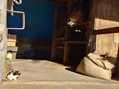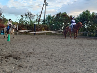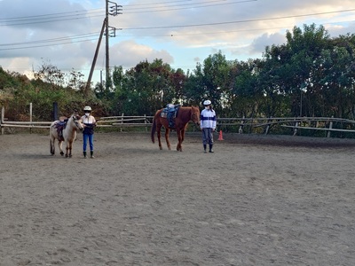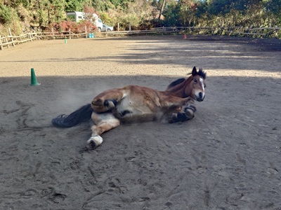 こんばんは。スーさんです。 今日は「勤労感謝の日」でした。日曜日だったので、明日は振替休日になります。 2025年最後の祝日ですね。 午後から牧場へ行ってきました。 日差しがあり、ポカポカ陽気。 ![]() 子猫が日向ぼっこしていました。ただ、視線の先にチャンプ。 そんなチャンプも馬房掃除のために、馬場に放牧すると…。 ![]() 砂浴び。 暖かかったし、気持ちいいのかな? 自分はテラとラッキーの馬房掃除をしました。 そして『野あそび会』です。 日曜日は、イベントや雨の関係などで、10月19日以来の開催になります。 一人お休みのため、二人の参加。 昔は、日曜日もメンバーが多く賑やかでしたが、今は一番少ない曜日になってしまいました。 ![]() キクとラッキーですね。 今日も「だるまさんが転んだ」を最初にやりました。 まずは引き馬から。 ![]() ラッキーは速歩も出て強かったですね。 何回かやったあと、乗馬でやりました。 ![]() 今度はキクの方が強かったです。ラッキーは駈歩が出しまったり、停まってもバックしたり…。 なかなか難しいですね。 ![]() そのあとは、蹄跡を部班運動。 駈歩までやりました。 ![]() 人数が少ないときの特権。 時間が余っていたので、簡単なパターンをやりました。 玄にいが走りながらコースを説明。 ![]() 歩様は、常歩、速歩、駈歩。 途中、左右の巻乗り、停止があります。 二人とも、歩様は出てたし、回数を重ねるごとにコース取りもうまくできました。 ![]() 始まった頃は少し寒いくらいでしたが、終わるころはかなり寒くなっていました。 写真ではわかりませんが、キクもラッキーも鼻息は白かったです。 今日は、昨日よりも少し寒かったような気がします。 ![]() 最後に玄にいから、パターンについては二人ともよかったという話がありました。コース取りがよくなっていたことや一応、歩様も出ていた点を評価していました。 「だるまさんが転んだ」での停まるときの力かげについては、自分で試していくようにとのことでした。強く手綱を引いてしまうと、バックしてしまうので。理想は、馬に停まれの合図をして、停まって馬が次の合図を待っている状態がいいようです。なかなか難しい話になってきますね。奥が深いです。 ![]() 今夜も晴れているので、明日の朝も寒くなるのかな。西側に月が見えました。 来週も日曜日は『野あそび会』あります。何をやるのかな? 富士宮でもインフルエンザが流行しているようで、学級閉鎖になっている学校もあると聞いたので、うがい・手洗いなどしっかりして、気をつけましょう。