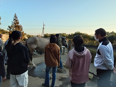 こんばんは。スーさんです。 今日は、晴れて暖かく、まさに春の陽気。 先週の雪と寒さが嘘のよう。 県内でも20℃を越えたところもありました。 花粉情報も、昨日の夜から「やや多い」にランクアップ。うれしくないですが、それだけ春に近づいているということですね。 今日も午後から牧場へ。 ![]() 「ファームステイ」に参加しているメンバーの乗馬が始まるところでした。 日差しがって、昨日よりも暖かかった。 馬のブラッシングをしていても、冬毛から夏毛に生え変わり始めているのか、抜けてきます。 日曜日の『野あそび会』も始まりました。 検定一日目です。 土曜日の振替のメンバーもいて、五人でした。 ![]() 今日も馬術の試験。 まず、ホープ単走で。 ![]() 次にラッキー、テラ、ホープ、チャンプで「レールワーク」の試験です。 歩様は駈歩まで、今日は、停止の号令もありました。 ![]() 最後は、パターン走行です。 まず五分間の練習時間が設けられました。 パターン走行するメンバーもいれば、蹄跡を歩くメンバーもいました。みんなパターン走行の練習をすると渋滞してしまうので、蹄跡を歩くこともいいですね。 ![]() ラッキー、テラ、チャンプ、ホープの順で二回ずつ走行しました。 ![]() 一通り馬術の試験は終わりました。 もう一回できるかもしれませんね。 そのあと、時間があったので、馬体の名称の勉強を。 ちょうどグラシオが戻ってきてくれたので、玄にいが説明してくれました。 ![]() 今回は、中級Cを受けるメンバーが多いので、肘、前膝、後膝、腰角、蹄叉、蹄踵を説明していました。 次回は、試験本番になります。 来週の日曜日は『野あそび会』はなかったけれど、検定の進捗により、行うことになりました。 発表会の練習も始めないといけないですね。ちょっとバタバタしそうです。