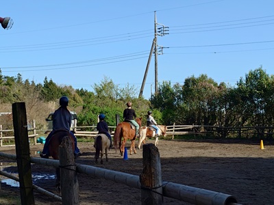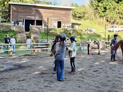 こんばんは。スーさんです。 今日は、晴れて暑い一日になりました。 静岡市では、30.3℃を観測し、本州で今年初の「真夏日」に。 静岡での最も早い「真夏日」は、4月1日だそうで、今日は、二番目に早い「真夏日」になったようです。 今日は午後から牧場へ。 「Gクレフ」のセラピー乗馬会からスタート。先週はあいにくの雨だったので、今日が新年度初のセラピー乗馬会です。午前に「ひとつ」と「カモミール」があったようです。 自分も、新年度初の牧場。本日はキクの引き馬を担当しました。 そして『野あそび会』が土曜日も新年度スタートです。 エサづくりをしてから、馬の手入れ、馬装をしてから乗馬です。 ![]() 乗る馬を替えることにしたメンバーも。 昨年度まで、ラッキーに乗っていたメンバーが、今日は初チャンプ。 今年に入ってチャンプに乗り始めたメンバーから、手綱についてちょっとしたアドバイスが。 ![]() 今回は、テラ、キク、ラッキー、チャンプの四頭出し。 新年度初なので、部班運動からスタート。歩様は速歩まで。 ![]() 後半は、巻乗りをして、スタート地点に戻ってくるパターンをやりました。 大体、二回目がうまく行きます。 ![]() キクが、巻乗りのパターンをしているときは、テラ、ラッキー、チャンプは、待機です。 玄にいからは、小さい巻乗りを左右にやるように言われていました。 ![]() 最後に玄にいから、常歩が基本とのことについて話がありました。 乗り手が馬の動きを感じ取ることなど話しをして終わりました。 明日も天気はいいようです。気温は今日ほどは上がらないようですが、20℃は越えてきそうです。